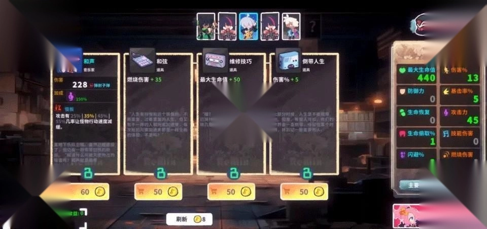 音乐家的攻击能触发各式各样的特效,像持续掉血、移速降低、弹射伤害、击退效果、冰冻控制、感电状态、暴击加成、斩杀机制等,数十种信物与上百种道具相互搭配,再结合英雄和音乐家的组合,能衍生出千变万化的战斗流派。