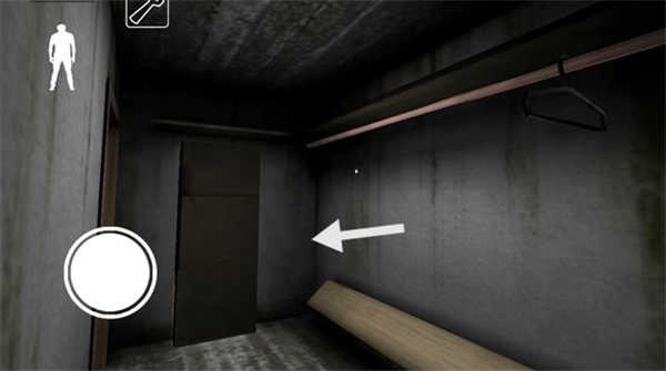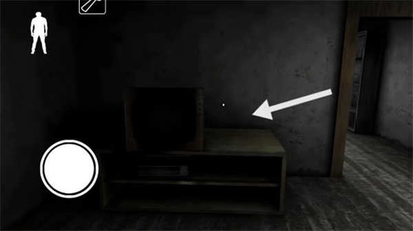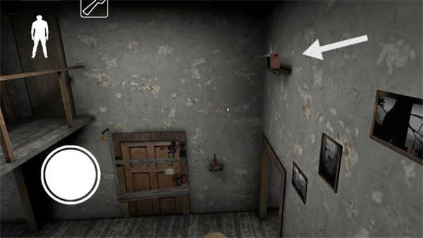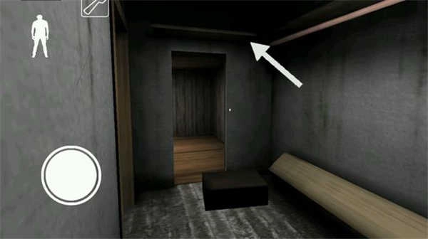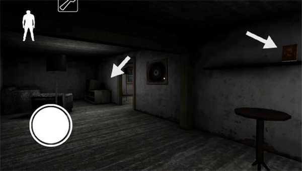 下楼梯后,左边地板上有一条黑线,从上面经过时铃铛会发出声响,需要留意。楼梯旁边的柜子可以用来躲藏,柜子对面有一扇门,门内或许会刷新物品。柜子旁边还有一扇门通往地下室(因为画面比较昏暗)