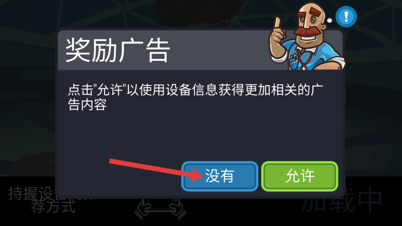 玩家启动游戏后,点击【没有】按钮就能关闭广告并进入游戏。
