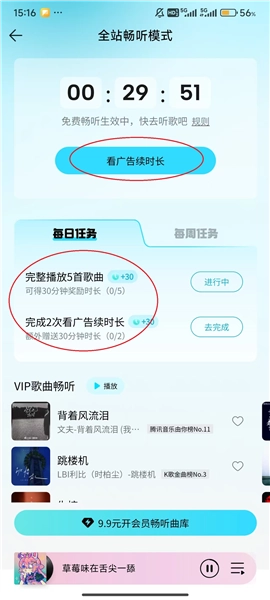 完成屏幕下方展示的每日任务,然后点击屏幕上方的“看广告续时长”按钮。