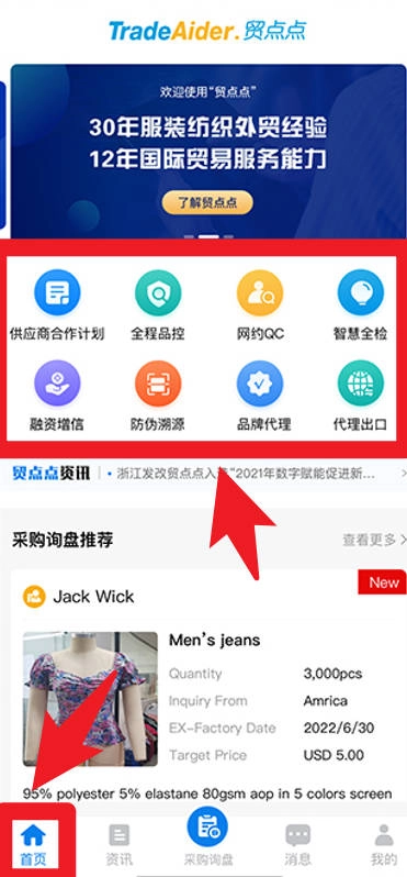 首页功能丰富多样,包含供应商合作计划、全程品控管理、融资增信服务、防伪溯源体系等多个模块,助力商家更高效地开展各项业务。