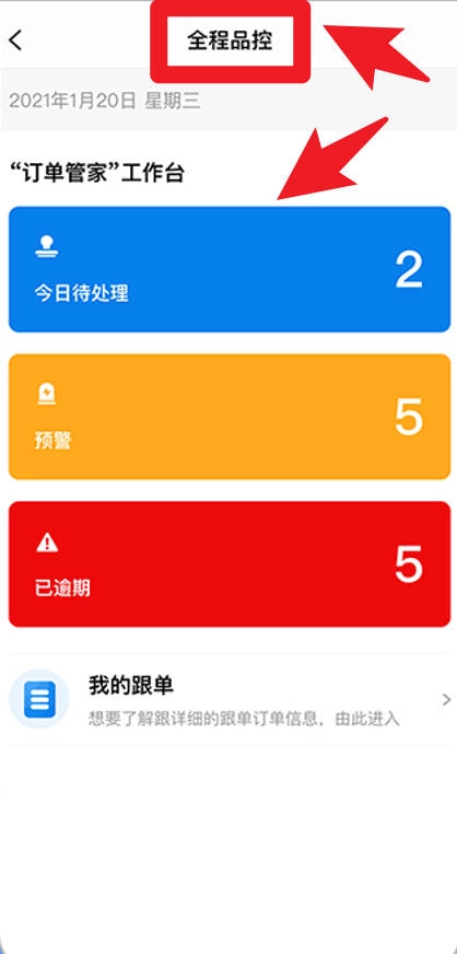 全程品控模块配备订单工作台,可呈现今日待处理、预警以及已逾期的订单信息,助力用户进行实时的跟踪与管理。