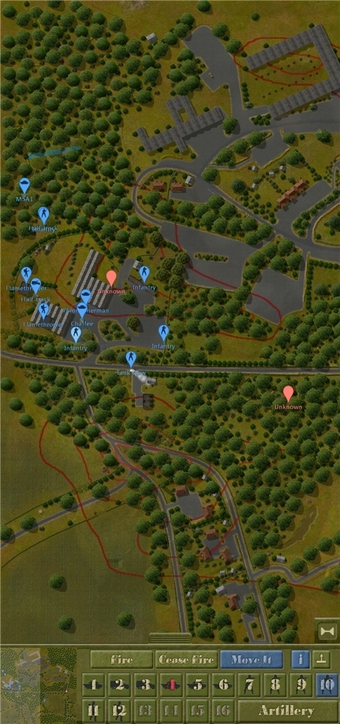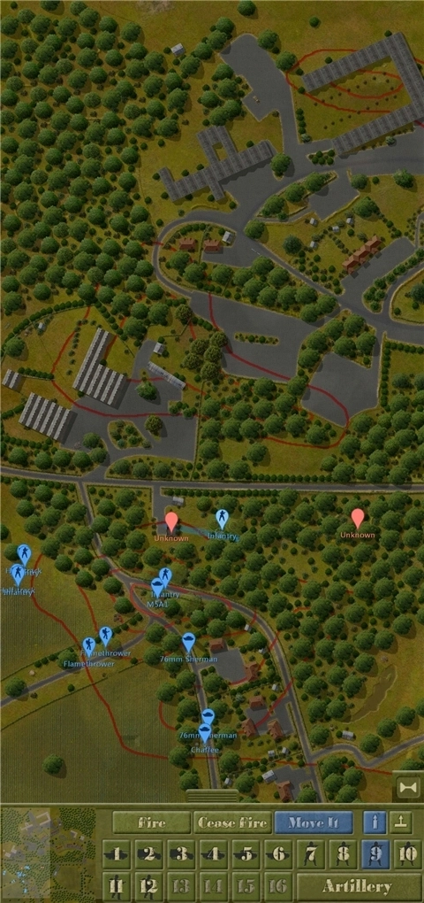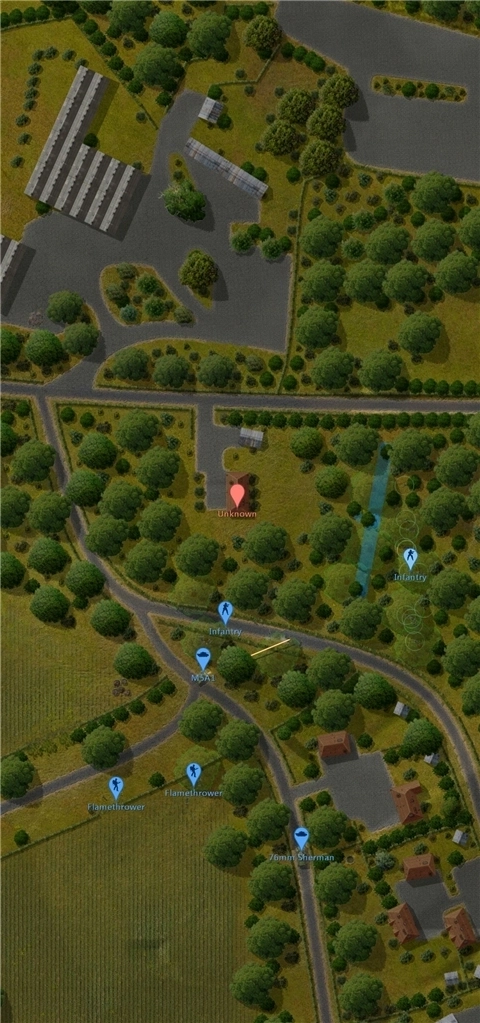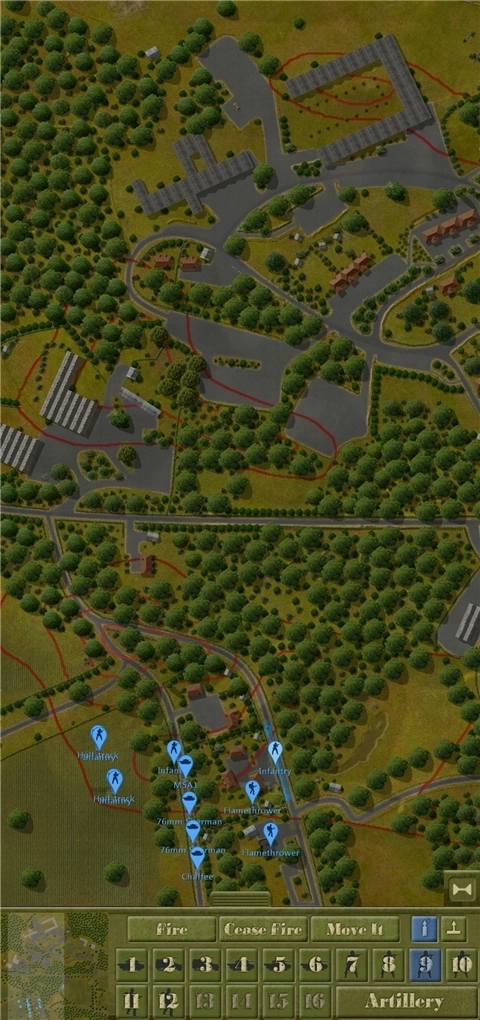 从图中可以看出,当前局势十分危急。我方回撤的残余部队已被敌人察觉,不过因其身处复杂的丛林环境,暂时未受到交叉火力的压制。我随即下令让他们发起强攻,并调派M5A1坦克予以支援;同时,部署在地图最左侧的机械步兵部队执行迂回穿插任务——该部所处位置被遮蔽物环绕,无需担忧会遭遇敌方火力打击。