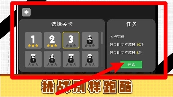关卡选择:在关卡界面中设有多样的挑战任务,玩家能够依据任务的完成条件来解锁更高的星级,随后点击开始按钮,开启全新的冒险征程。