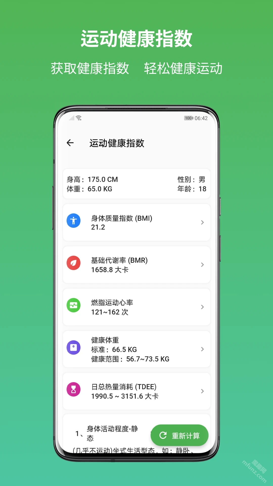 健身指数计算器:整合BMI、BMR、燃脂心率、健康体重、每日总热量消耗等多项运动健康指标,助力您更高效、更健康地开展运动。