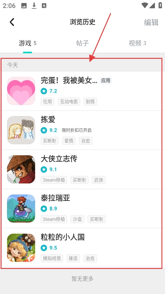 打开浏览历史页面后,切换到游戏分类标签,之前浏览过的游戏内容就会集中展示出来,像《完蛋!我被美女包围了!》《拣爱》这类游戏都包含在这个列表里哦。