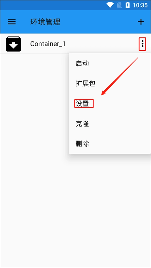 找到文件“Container_1”右侧的三点图标,点击该图标后选择“设置”选项。
