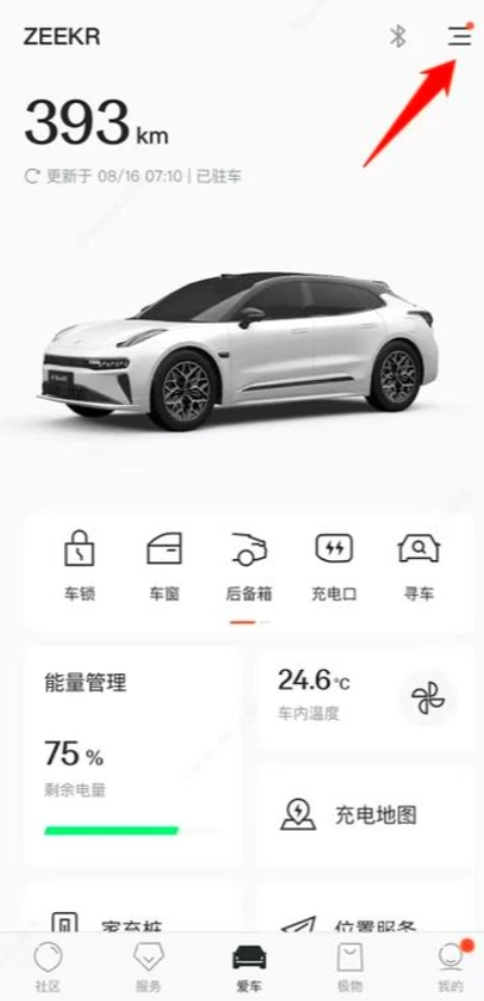 车主打开极氪应用后,进入“爱车”页面,接着点击该页面右上角的三条横线样式的菜单按钮。
