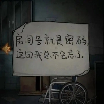 往右边走,床头放着一张小纸条,查看后发现上面写着房间号就是密码。虽然暂时不清楚这是哪里的密码,但待会儿肯定得留意一下房间号。事不宜迟,先回到左边门的场景,掀开帘子时会有小高能,之后看到对面的房间号是2012,这么看来,这个房间不是2011就是2013了。