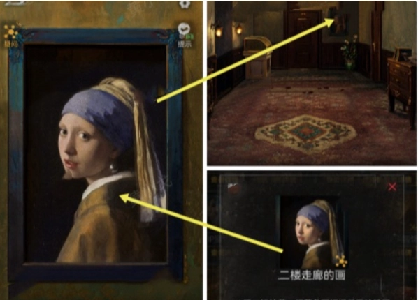 点击墙上的画作,留意画框的颜色以及人物眼睛朝向蓝下的细节,就能获取关于二楼走廊那幅画的线索。