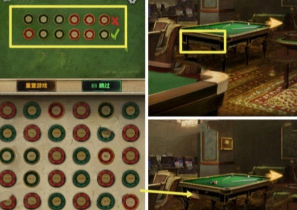 在会所一楼的台球厅里,点击左侧墙上的骰子装饰,能获取到一条线索:金骰子装饰。仔细观察这个骰子的颜色和点数,会发现它是金色的,点数为六。