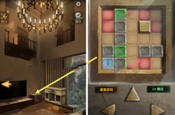 点击电视旁的立方体,完成推箱子小游戏后移开它,接着前往游泳池。