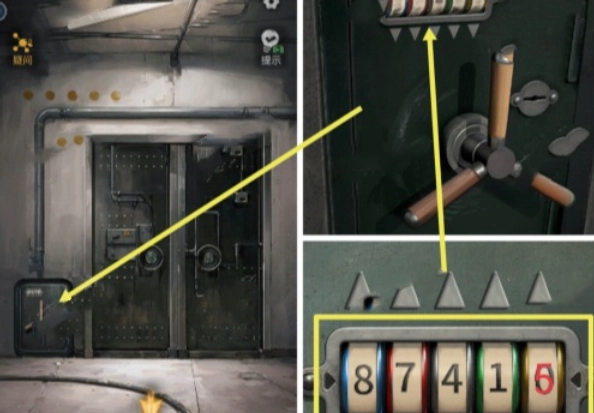 点击密码箱的密码锁,依据提示的颜色输入密码87415:蓝色对应三横两点的8、红色对应两横三点的7、黑色对应四点一横的4、绿色对应一点四横的1、黄色对应五个点的5。