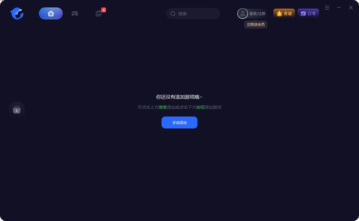 打开海豚加速器电脑版的主界面后,能看到界面上设有【首页】、【电脑游戏】、【主机游戏】以及【登录/注册】这几个选项,接着点击【登录/注册】选项。