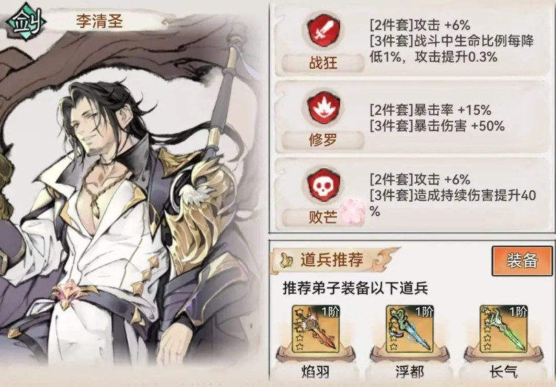 为了让李清圣的输出达到最高,建议挑选能提升暴击率、暴击伤害和攻击力的装备。在法宝的选择上,要选和他功法属性相契合的,像火系法宝这类,这样可以强化属性增伤的作用。
