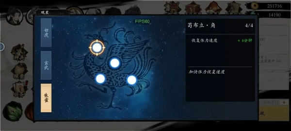 再去点观星功能!观星按钮在界面右上角,观星点数没点满之前是可以重置的!喜欢刷图的玩家记得把朱雀系的体力恢复加速点出来!之后再去点旁边挂机时长后面的选项!