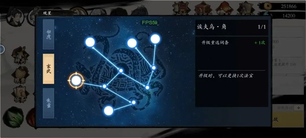 图内可以免费刷新一次选择法宝,若观星点出玄武系法宝,刷新次数会增加一次,而且每次升级都能更换一次法宝。