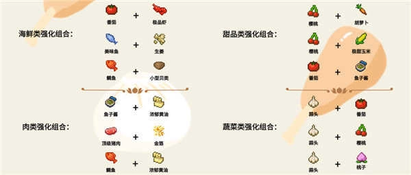 每种菜品依据自身的风味特点与所属品类,都存在最适配的强化食材,这部分内容只能依靠日常的经验积累去自行探寻,在此仅能列举一些较为通用的例子供大家参考。