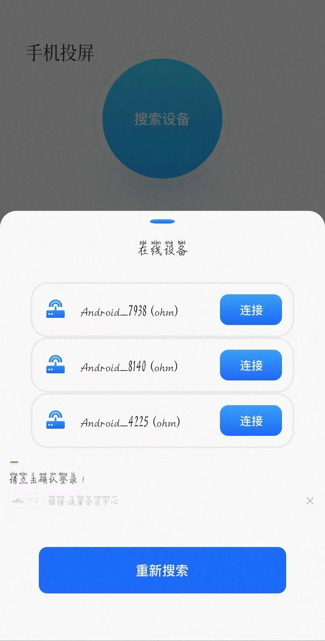 搜索完成后,页面会呈现出您的电视等设备,直接点击就能完成连接。