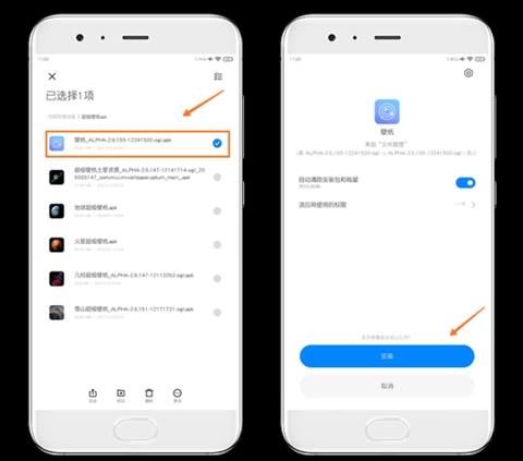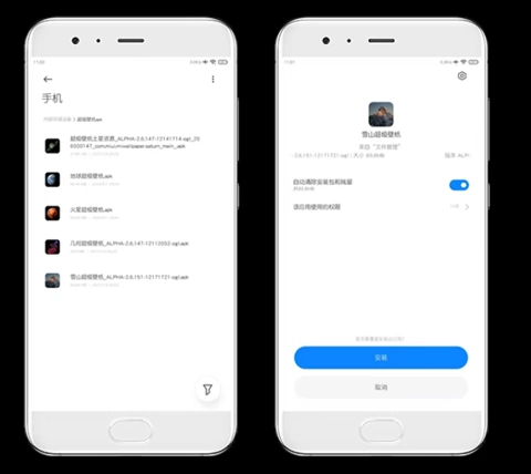 接下来,有5个超级壁纸安装包可供选择,你只需在MIUI的【文件管理器】里找到自己喜欢的那一个,点击安装就能完成操作。像最近新推出的“24时雪山超级壁纸”,它的版本号是“ALPHA-2.6.151-12171721-ogl”,具体情况可参考下图: