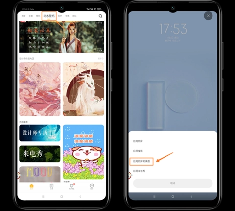打开MIUI桌面的【小米主题】应用,找到【动态】壁纸分类栏,从中任意挑选一款动态壁纸,然后将其同时应用到【锁屏】和【桌面】上。